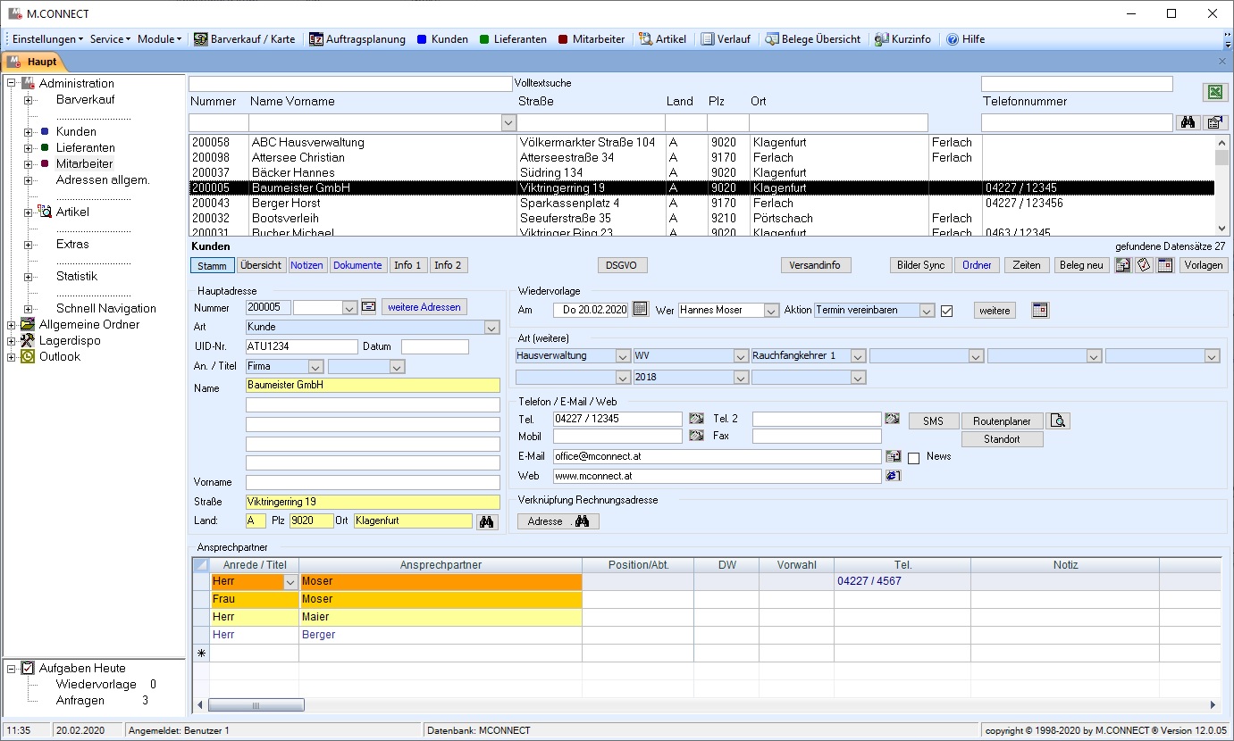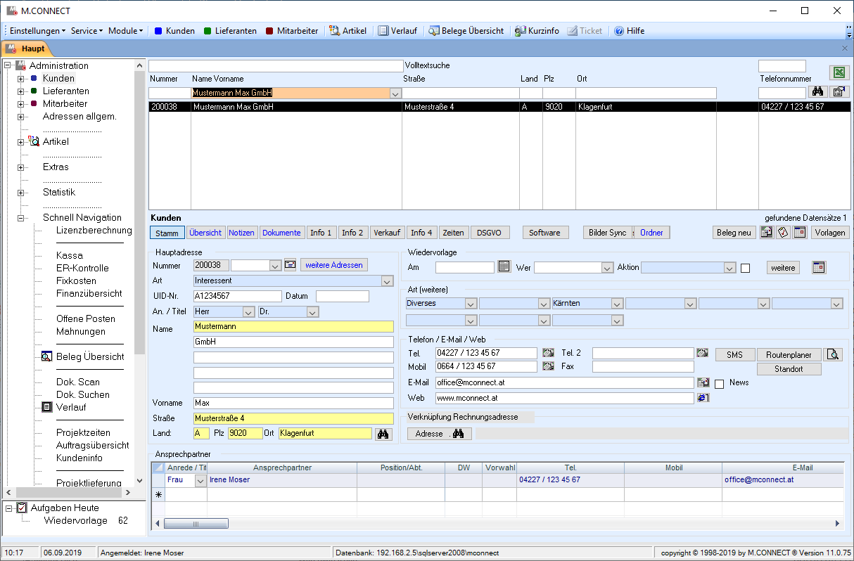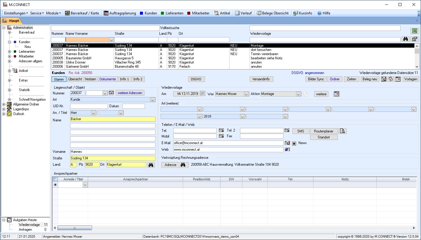 Übersichtliche und vielfältige Adressverwaltung getrennt nach Kunden, Lieferanten, Mitarbeiter und allgemeine Adressen. Beliebig viele Ansprechpartner inkl. Kontaktdaten zu jeder Adresse verfügbar. Mehrere Nebenadressen zu jeder Hauptadresse z. B. Liefer- und Rechnungsadresse möglich. Adressverknüpfungen z. B. für Hausverwaltungen und Mieter etc. Volltextsuche zum raschen Finden der Adresse. Direktmail, Routenplaner, SMS Versand – alles direkt aus der M.EINS Software mit nur 1 Klick. Wiedervorlagesystem als Arbeitsunterstützung.