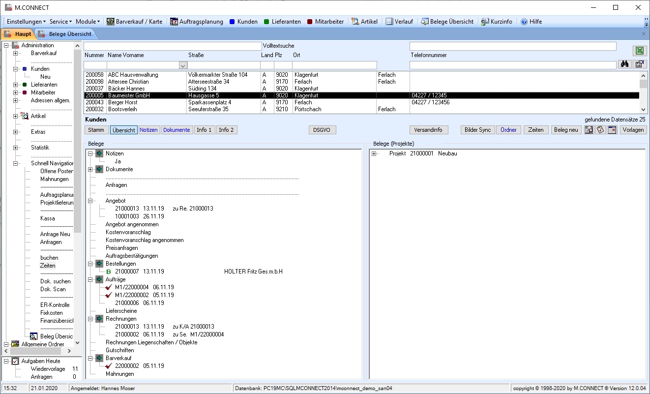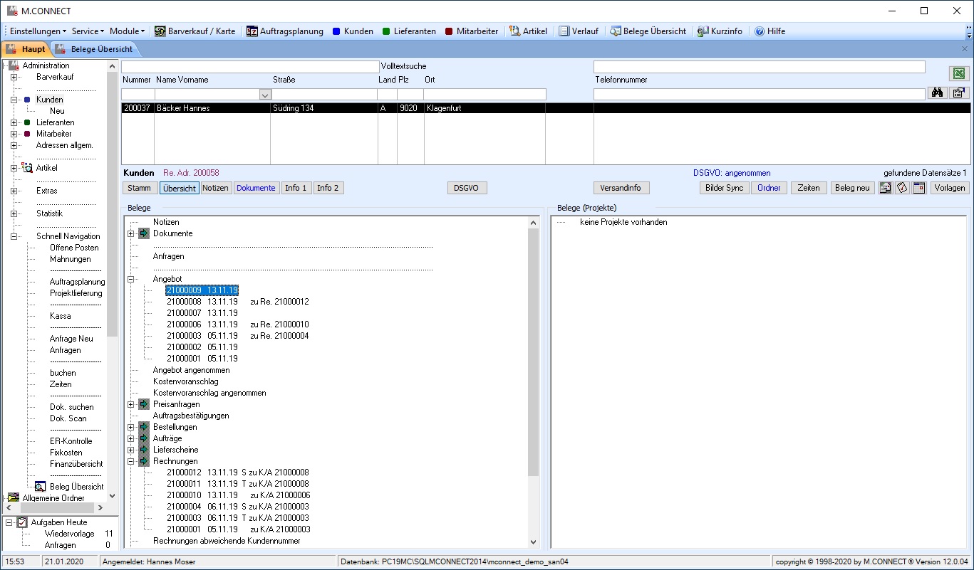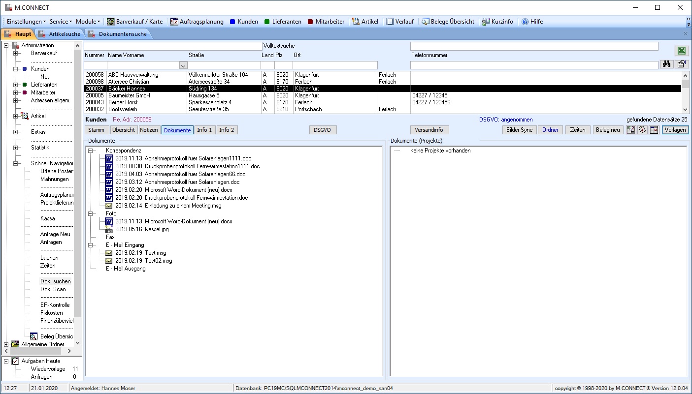 Übersichtliche und vielfältige Adressverwaltung getrennt nach Kunden, Lieferanten, Mitarbeiter und allgemeine Adressen. Beliebig viele Ansprechpartner inkl. Kontaktdaten zu jeder Adresse verfügbar. Mehrere Nebenadressen zu jeder Hauptadresse z. B. Liefer- und Rechnungsadresse möglich. Adressverknüpfungen z. B. für Hausverwaltungen und Mieter etc. Volltextsuche zum raschen Finden der Adresse. Direktmail, Routenplaner, SMS Versand – alles direkt aus der M.EINS Software mit nur 1 Klick. Wiedervorlagesystem als Arbeitsunterstützung.