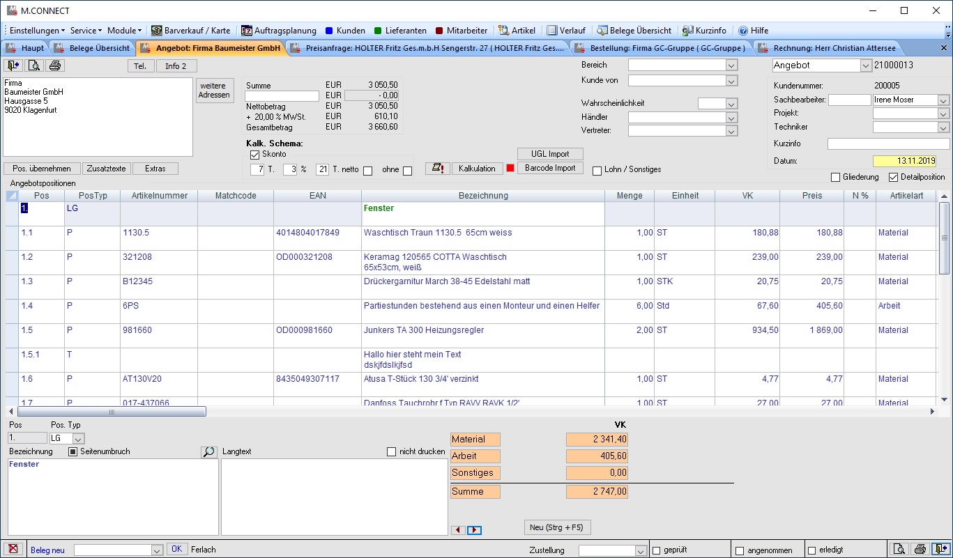Im Artikelstamm sehen Sie alle Ihre Artikel und es stehen umfangreiche Filter und Suchfunktionen zur Verfügung. Einspielen Ihrer Artikel über Datanorm oder Excel Mappen. Einfaches Anlegen von manuellen Artikeln mit verschiedenen Kalkulationsmöglichkeiten. Farbcodes für Löschartikel, manuelle Artikel, Stücklistenartikel usw. Zusätzlich stehen auch selbstdefinierte Produktgruppen zur Verfügung – damit finden Sie Ihre gängigsten Artikel mit nur 1 Mausklick – und das auch in jedem Beleg. Stücklisten für rasches Erstellen von z. B. Angeboten, Rechnungen usw. Definition von Hauptlieferant und Nebenlieferanten.