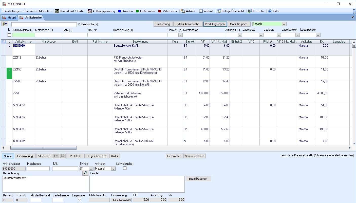 Einspielen des Artikelstammes von Lieferanten über Datanorm: Neuanlage, Warengruppen, Rabattdateien und Nettopreisliste. Einspielen auch während des Arbeitens möglich.