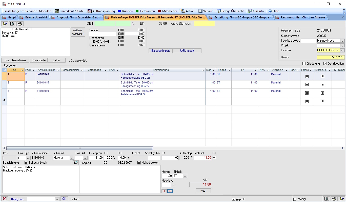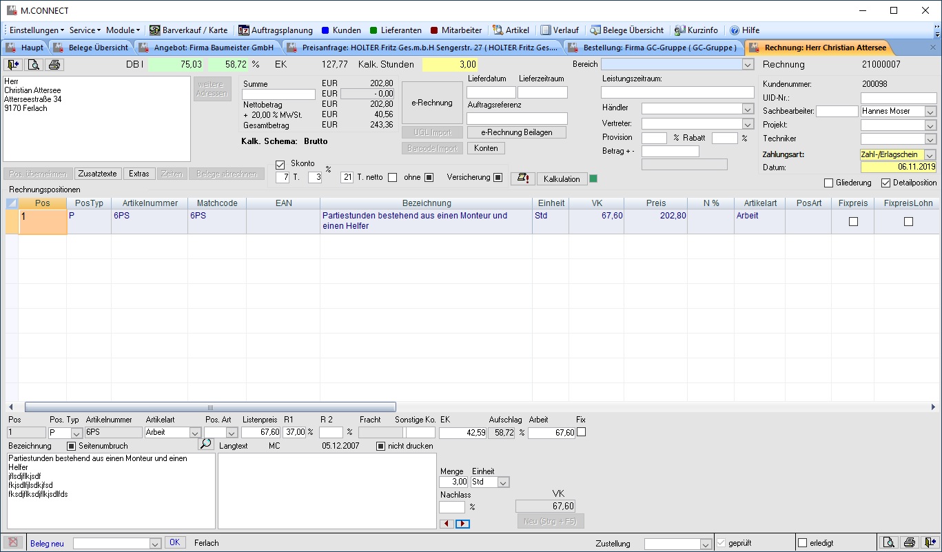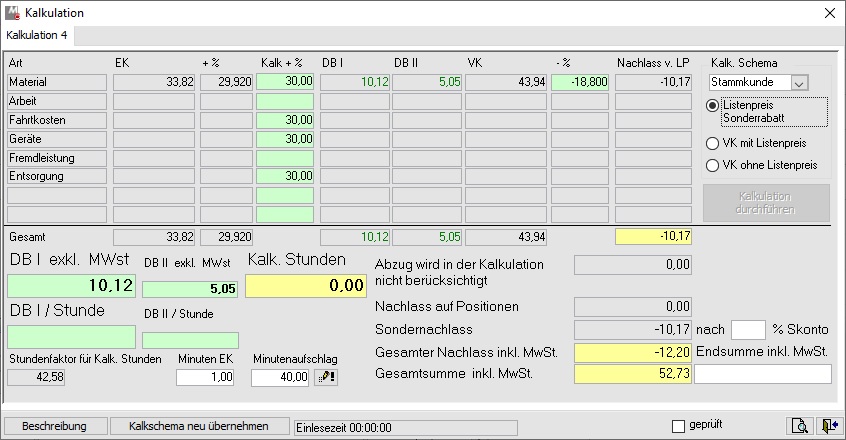 Damit Sie wissen was bleibt, stehen Ihnen in der M.EINS Branchensoftware verschiedene Kalkulationen bei Angeboten, Auftragsbestätigungen und Rechnungen zur Verfügung. Egal ob Einkaufspreis mit Aufschlag oder Nachlässe vom Listenpreis der Lieferanten alles ist mit wenigen Mausklicks möglich. M.EINS sagt Ihnen auch gleich in EURO-Beträgen, was Sie verdienen (Deckungsbeiträge mit und ohne Gemeinkostenberücksichtigung). Kalkulieren Sie z. B. auch nach verschiedenen Artikelarten oder nach Lieferanten. Fixpreise lassen sich ganz leicht festlegen und manuelle Eingaben sind ebenso möglich. Verschiedene Ausdruckmöglichkeiten lassen den Nachlass aufscheinen oder auch nicht. Ganz wie Sie es wünschen.