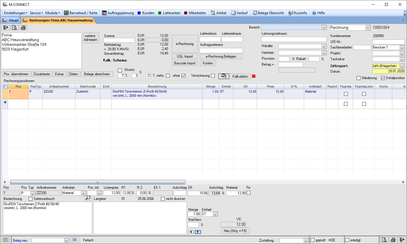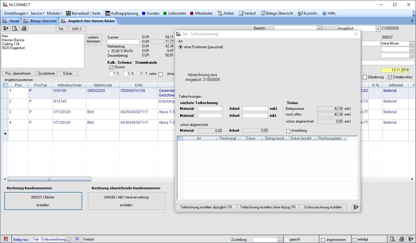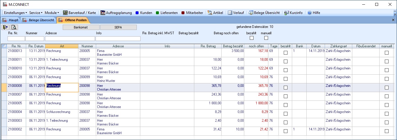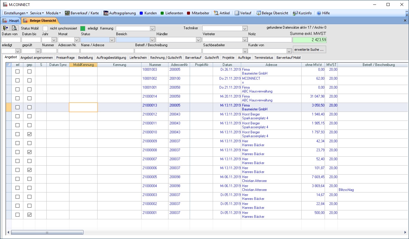Mit der M.EINS Branchensoftware haben Sie alle Möglichkeiten Belege zu erstellen. Es gibt keine Einschränkungen gegenüber den anderen Softwareprodukten von M.CONNECT. Folgende Belege können Sie erstellen: