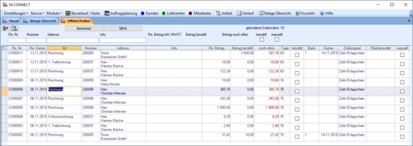 Sobald eine Rechnung in der M.EINS Software erstellt ist, erscheint diese chronologisch gereiht in der Offenen Posten Verwaltung. Bei Zahlungseingang kann dieser unkompliziert zur Rechnung erfasst werden. Alle Optionen sind möglich, Einmalzahlung, Teilzahlungen oder Zahlungen mit Skonto.